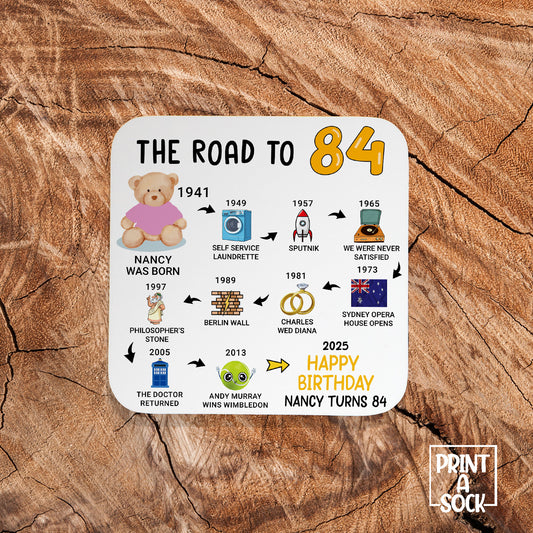 Personalised 84th Birthday Gift - Born in 1941 - The road to 2025 - Coaster