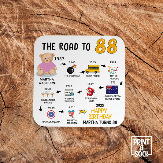 Personalised 88th Birthday Gift - Born in 1937 - The road to 2025 - Coaster