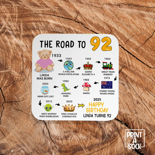 Personalised 92nd Birthday Gift - Born in 1933 - The road to 2025 - Coaster