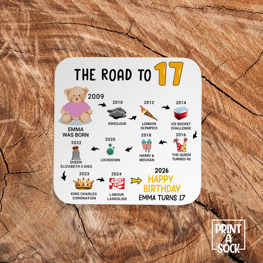 Personalised 17th Birthday Gift - Born in 2009 - The road to 2026 - Coaster