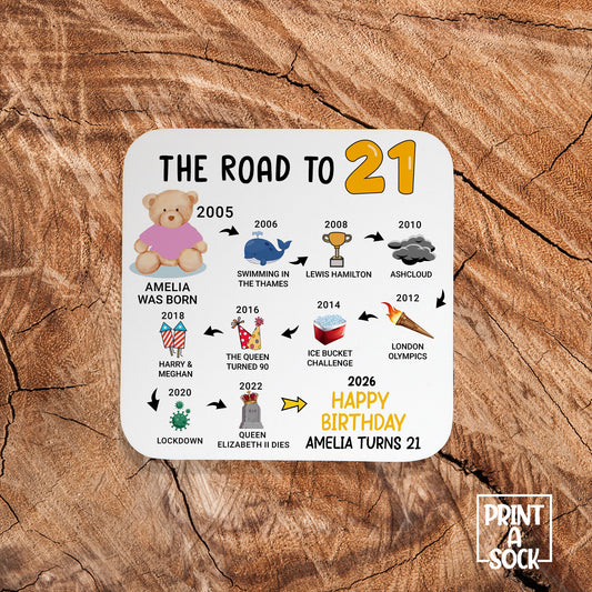 Personalised 21st Birthday Gift - Born in 2005 - The road to 2026 - Coaster