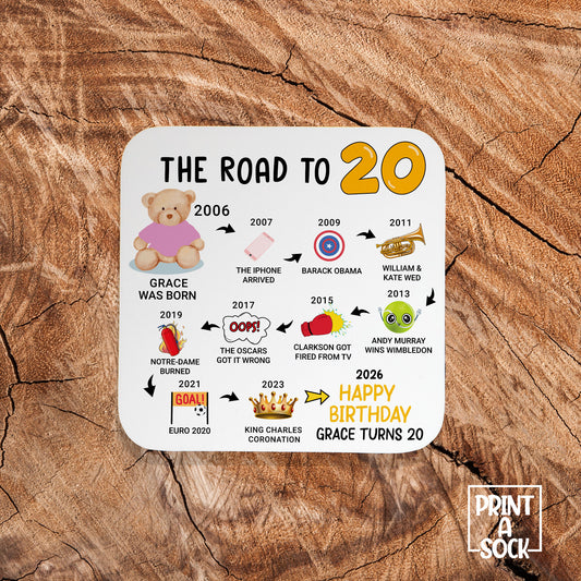 Personalised 20th Birthday Gift - Born in 2006 - The road to 2026 - Coaster