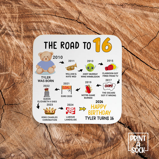 Personalised 16th Birthday Gift - Born in 2010 - The road to 2026 - Coaster