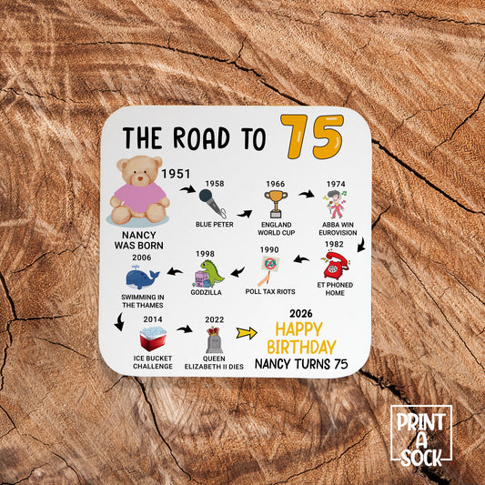 Personalised 75th Birthday Gift - Born in 1951 - The road to 2026 - Coaster