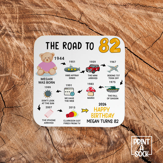 Personalised 82nd Birthday Gift - Born in 1944 - The road to 2026 - Coaster
