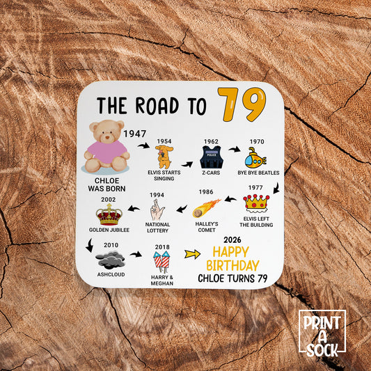 Personalised 79th Birthday Gift - Born in 1947 - The road to 2026 - Coaster
