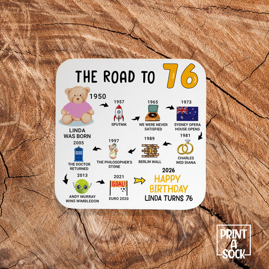 Personalised 76th Birthday Gift - Born in 1950 - The road to 2026 - Coaster