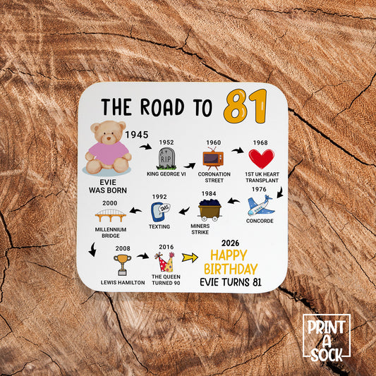 Personalised 81st Birthday Gift - Born in 1945 - The road to 2026 - Coaster