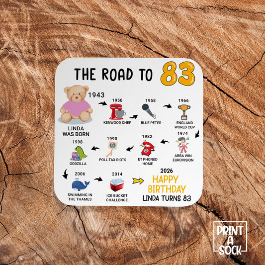 Personalised 83rd Birthday Gift - Born in 1943 - The road to 2026 - Coaster
