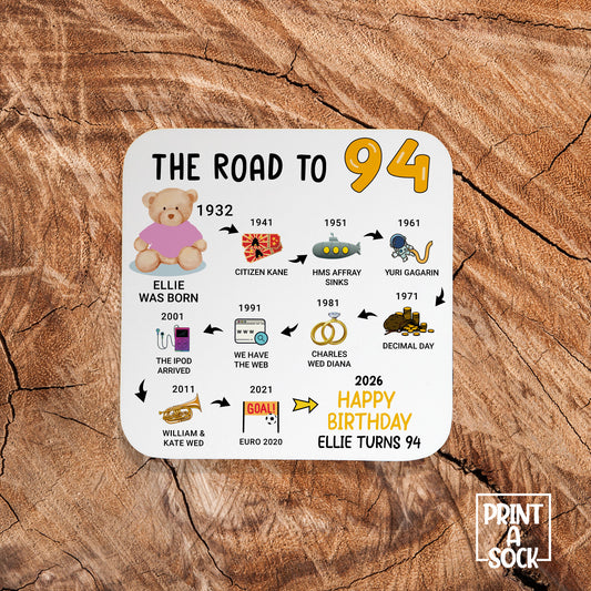 Personalised 94th Birthday Gift - Born in 1932 - The road to 2026 - Coaster