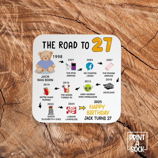 Personalised 27th Birthday Gift - Born in 1998 - The road to 2025 - Coaster
