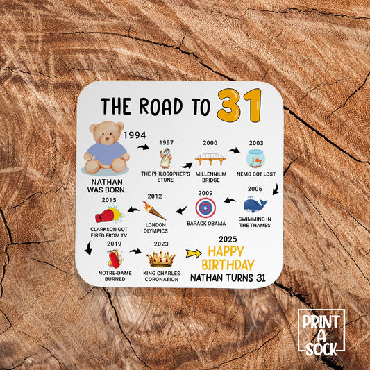 Personalised 31st Birthday Gift - Born in 1994 - The road to 2025 - Coaster