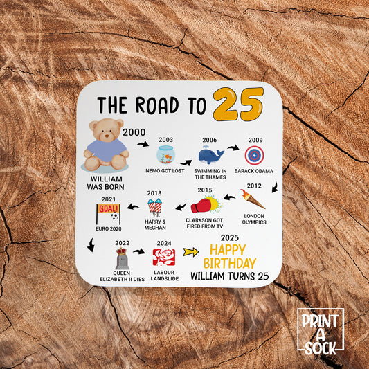 Personalised 25th Birthday Gift - Born in 2000 - The road to 2025 - Coaster