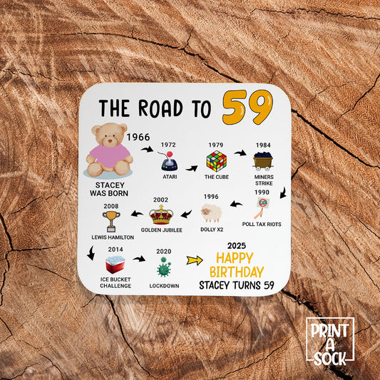 Personalised 59th Birthday Gift - Born in 1966 - The road to 2025 - Coaster