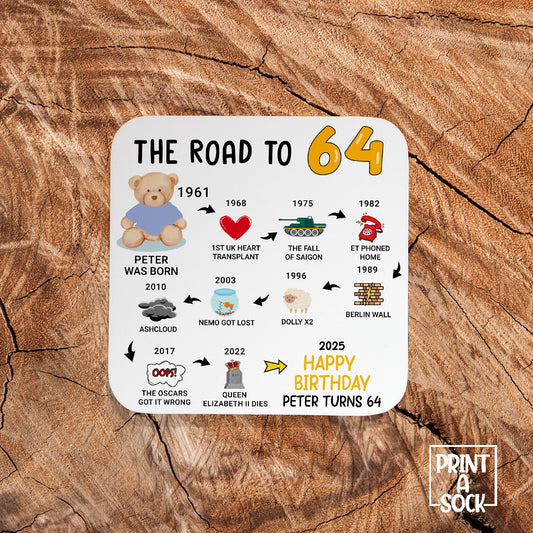 Personalised 64th Birthday Gift - Born in 1961 - The road to 2025 - Coaster
