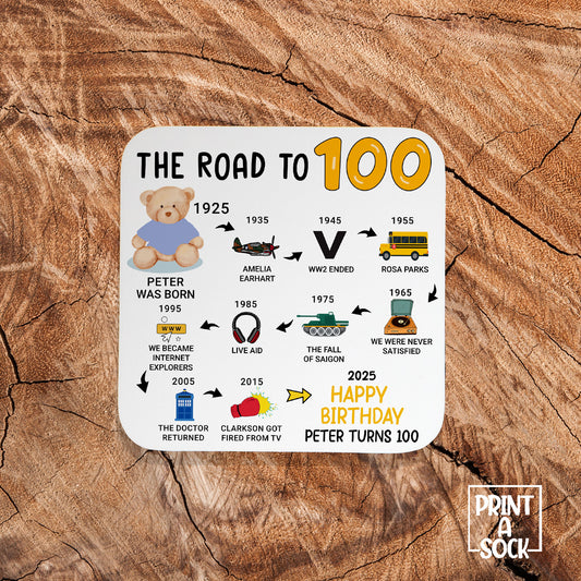 Personalised 100th Birthday Gift - Born in 1925 - The road to 2025 - Coaster