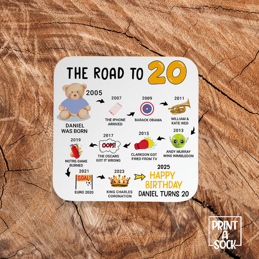 Personalised 20th Birthday Gift - Born in 2005 - The road to 2025 - Coaster