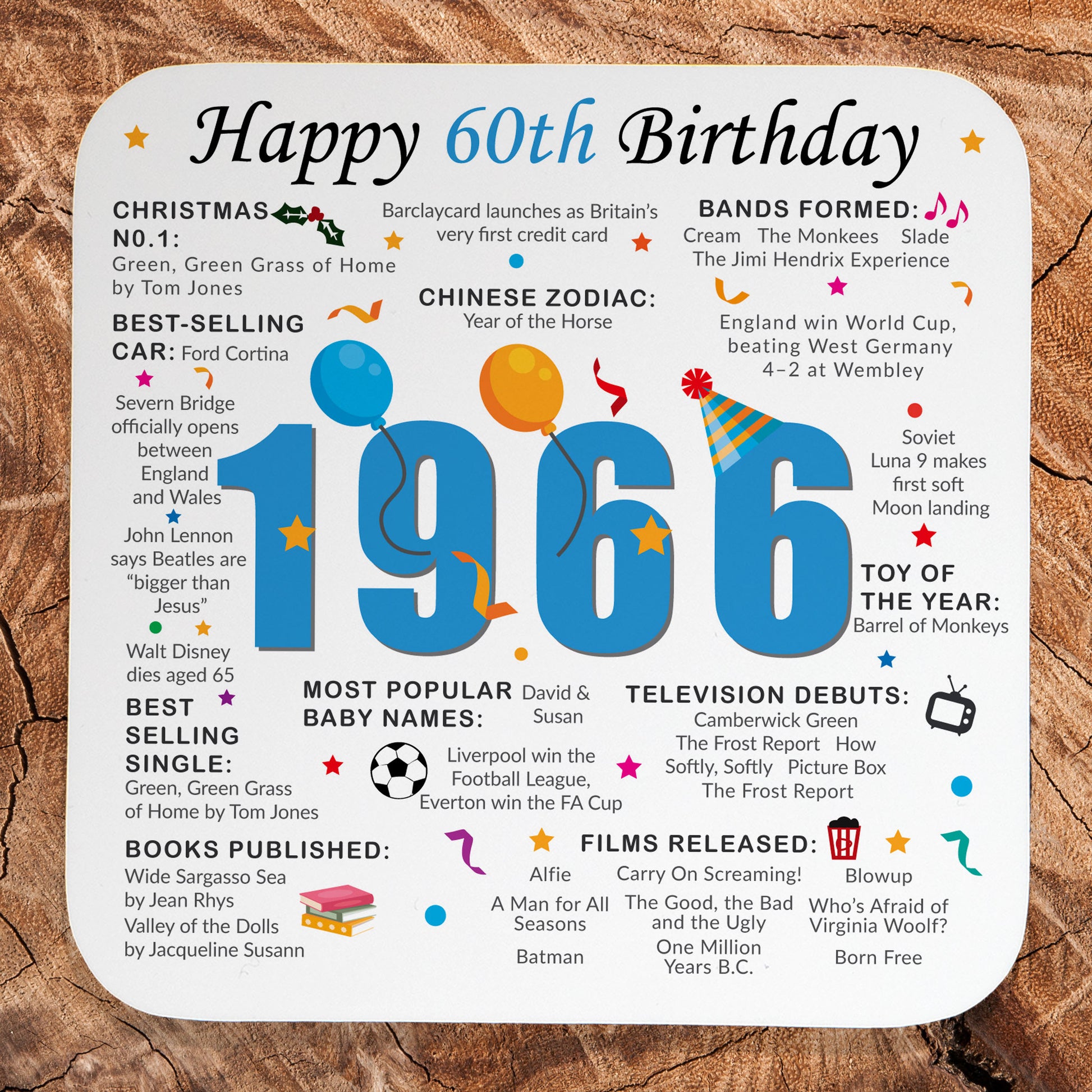 Make your 60th extra special with our 60th Birthday Coaster β Born in 1966 Facts. It's not just a coaster; it's a tribute to the year you made your grand entrance. π