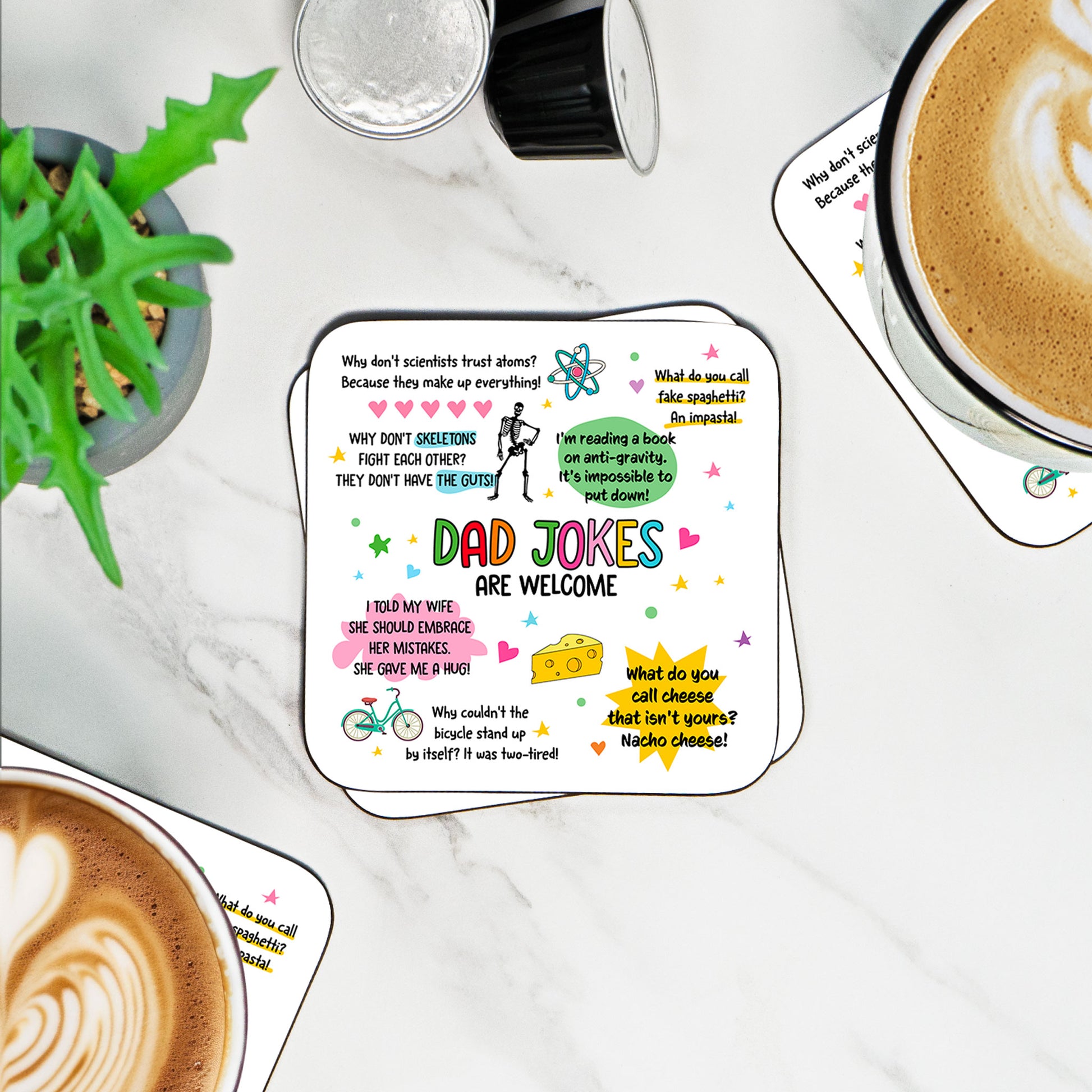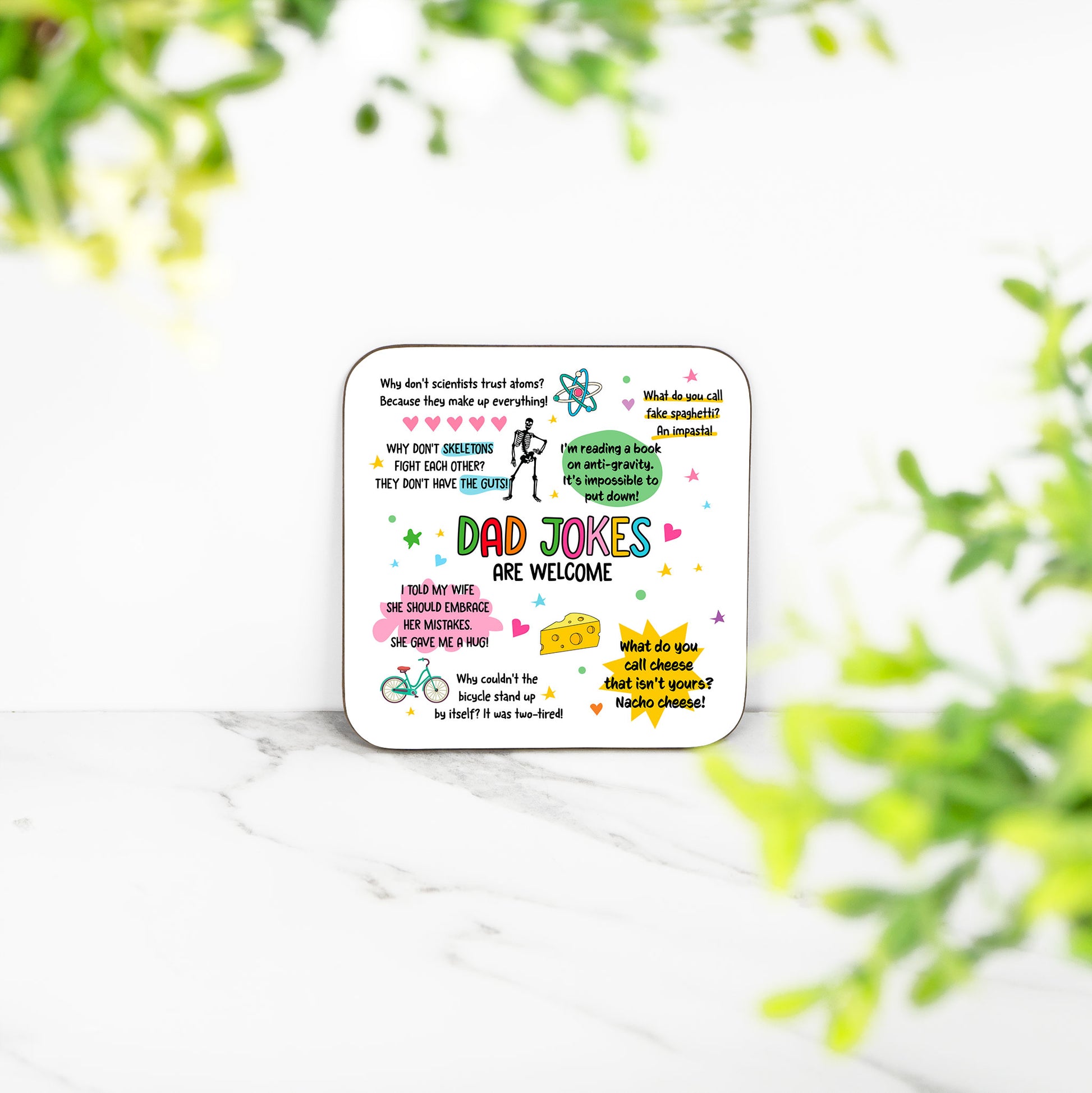 Looking for a gift that will make your dad chuckle? Our Dad Jokes Coaster is the perfect solution! Packed with classic dad jokes, this coaster will bring joy and laughter to your dad every day. Made from high-quality materials, it not only protects surfaces from spills and heat but also adds a touch of humour to any room. Ideal for Father's Day, birthdays, or any special occasion, this coaster is a thoughtful and practical gift. Surprise your dad with a present that combines functionality with fun. Order yours now and brighten your dad's day!