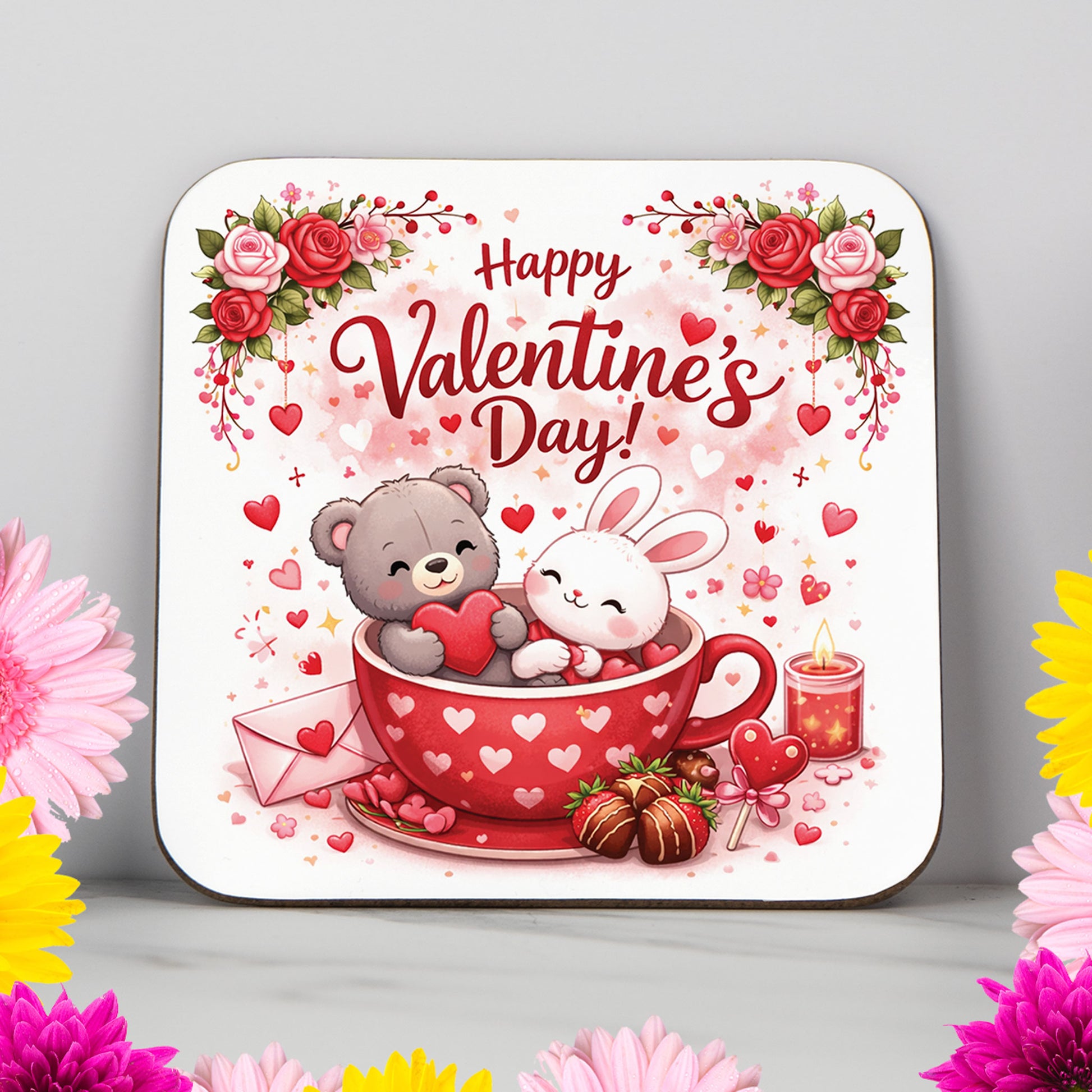 Featuring a sweet bear and bunny sharing a heart inside a cosy mug, surrounded by flowers, chocolates, and romantic details, this design is made to feel warm, thoughtful, and genuinely special.