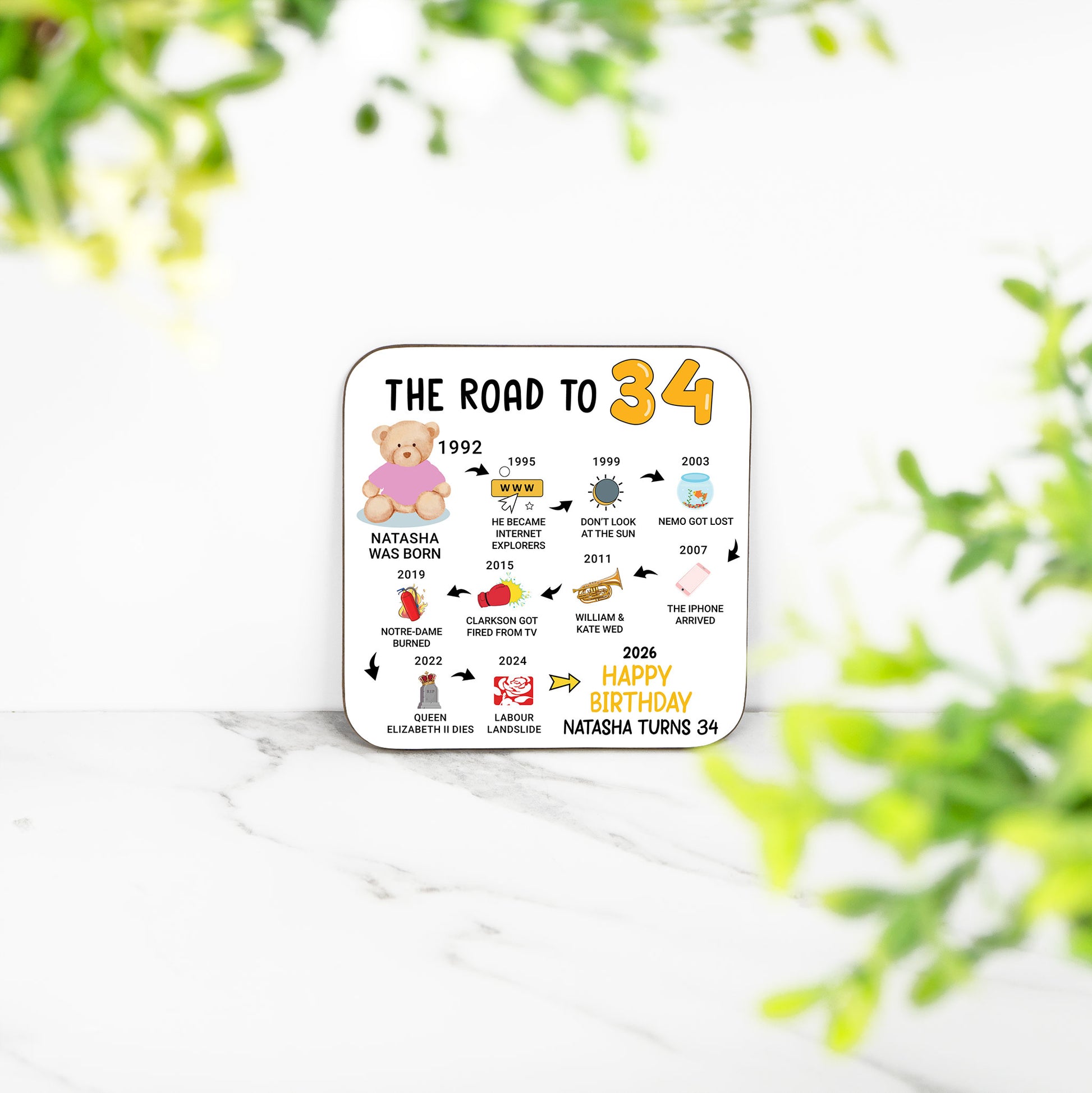 Personalised 34th Birthday Gift - Born in 1992 - The road to 2026 - Coaster