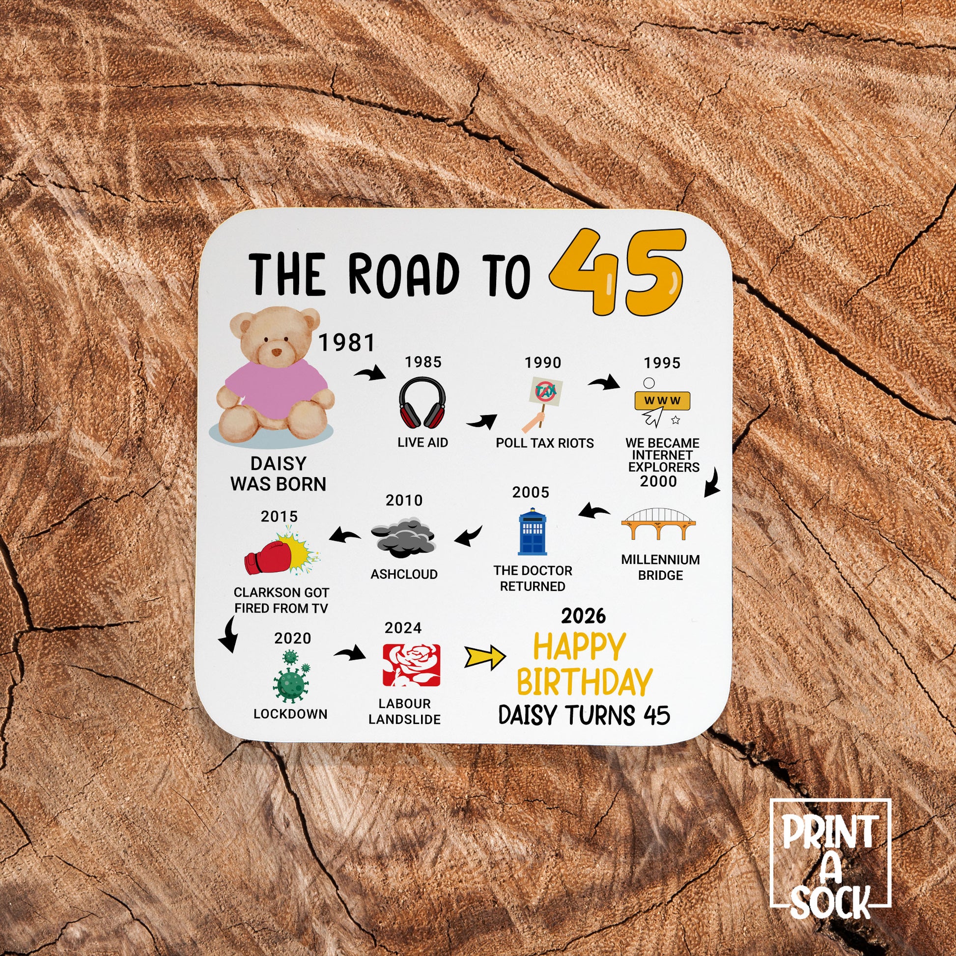 Personalised 45th Birthday Gift - Born in 1981 - The road to 2026 - Coaster