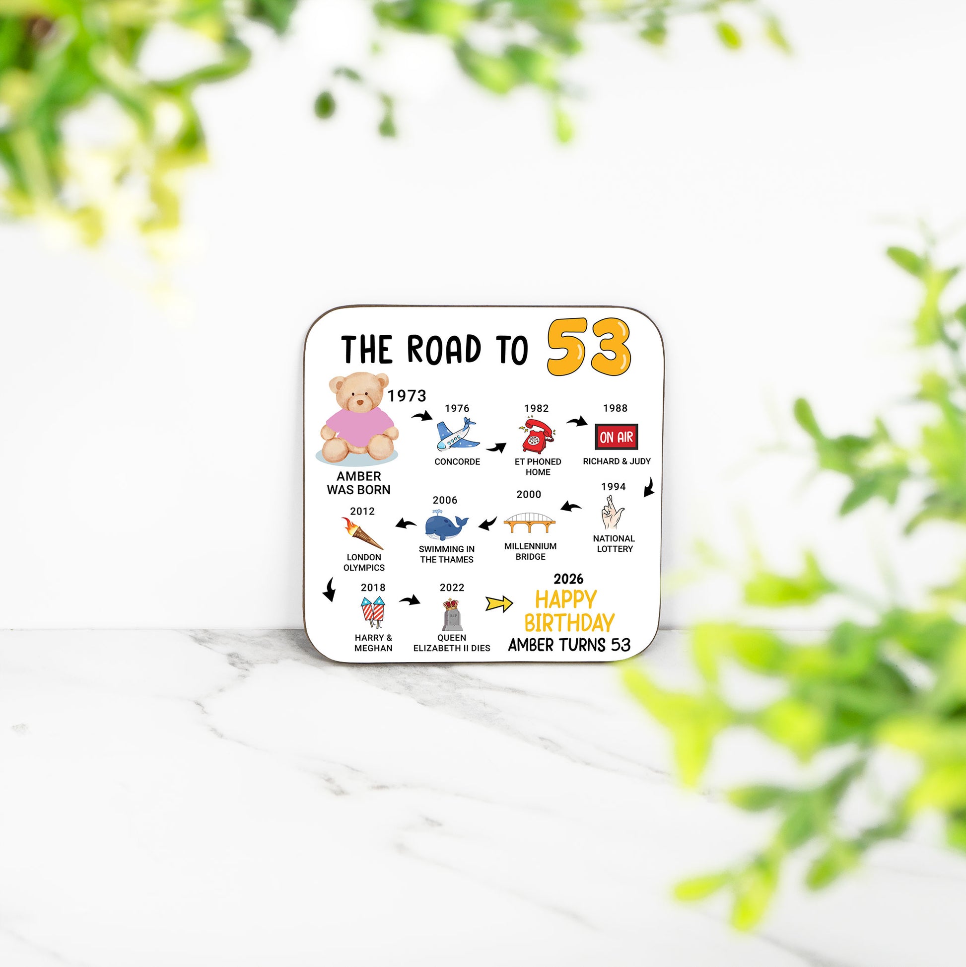 Personalised 53rd Birthday Gift - Born in 1973 - The road to 2026 - Coaster