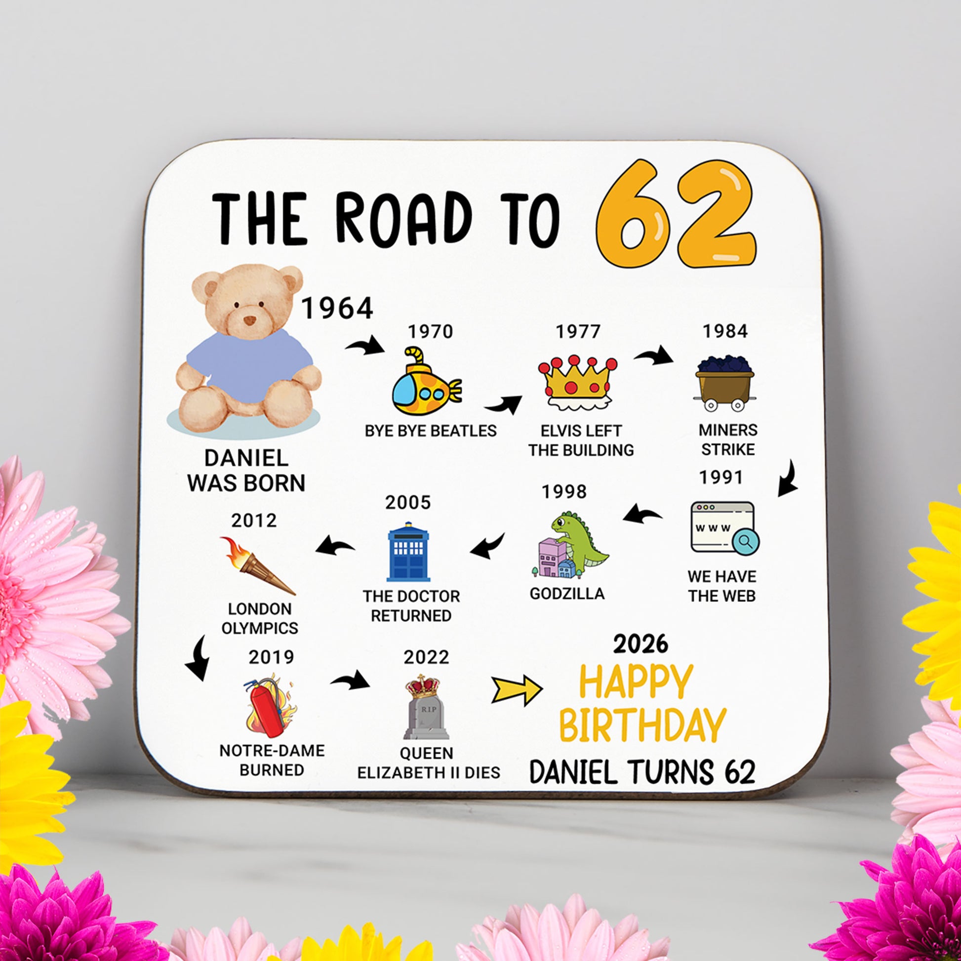 Personalised 62nd Birthday Gift - Born in 1964 - The road to 2026 - Coaster