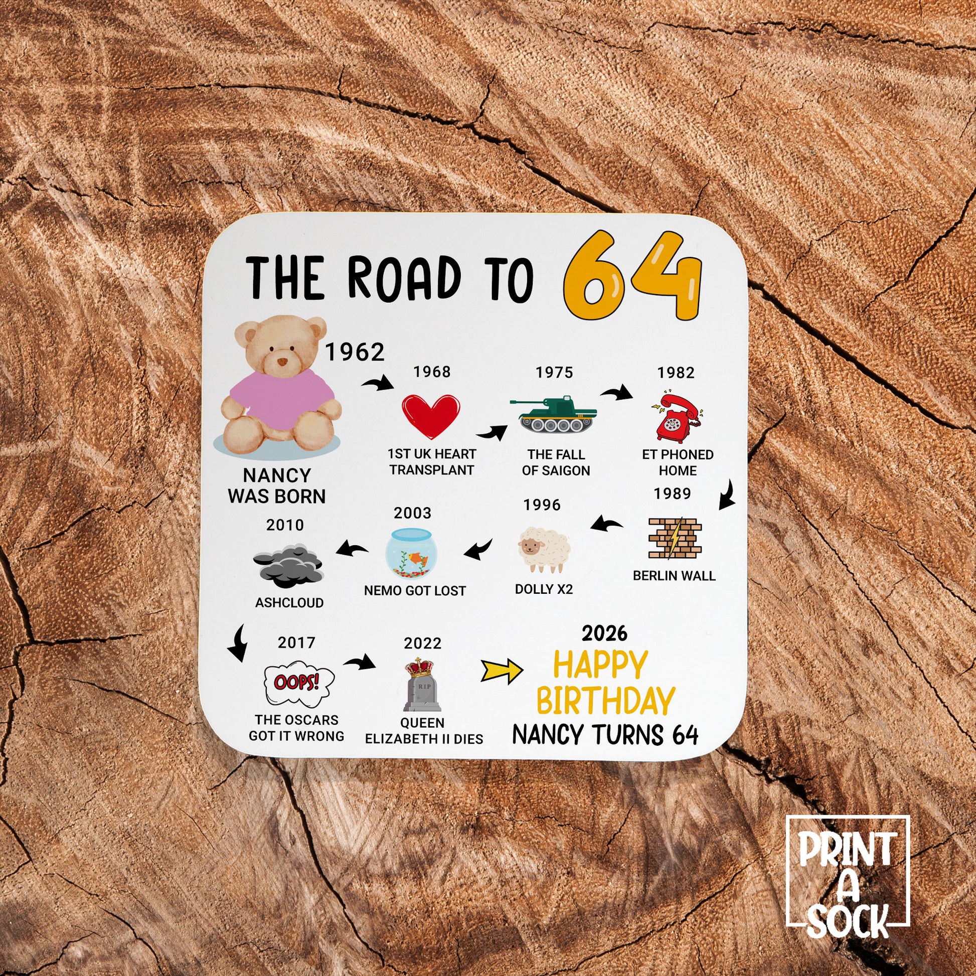 Personalised 64th Birthday Gift - Born in 1962 - The road to 2026 - Coaster