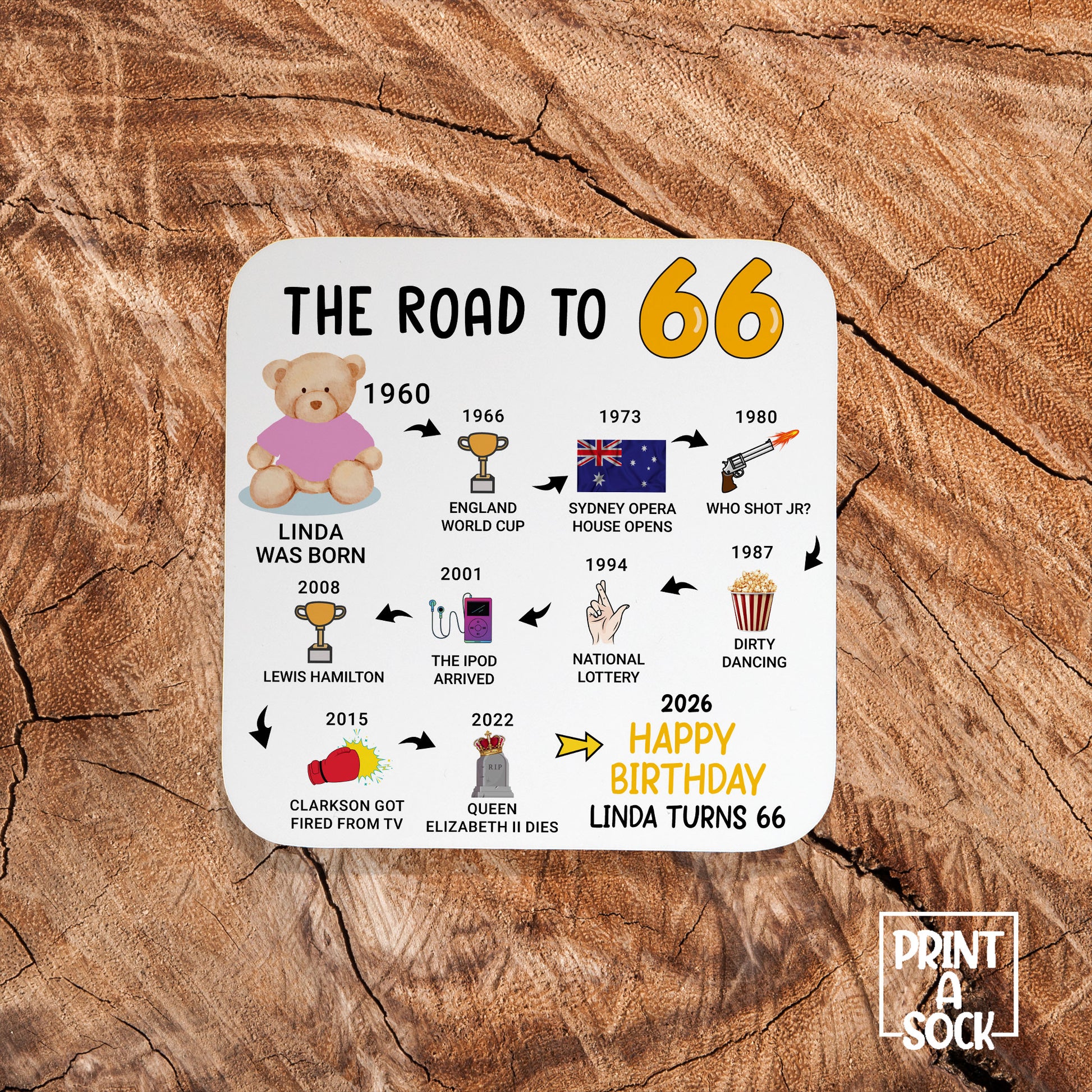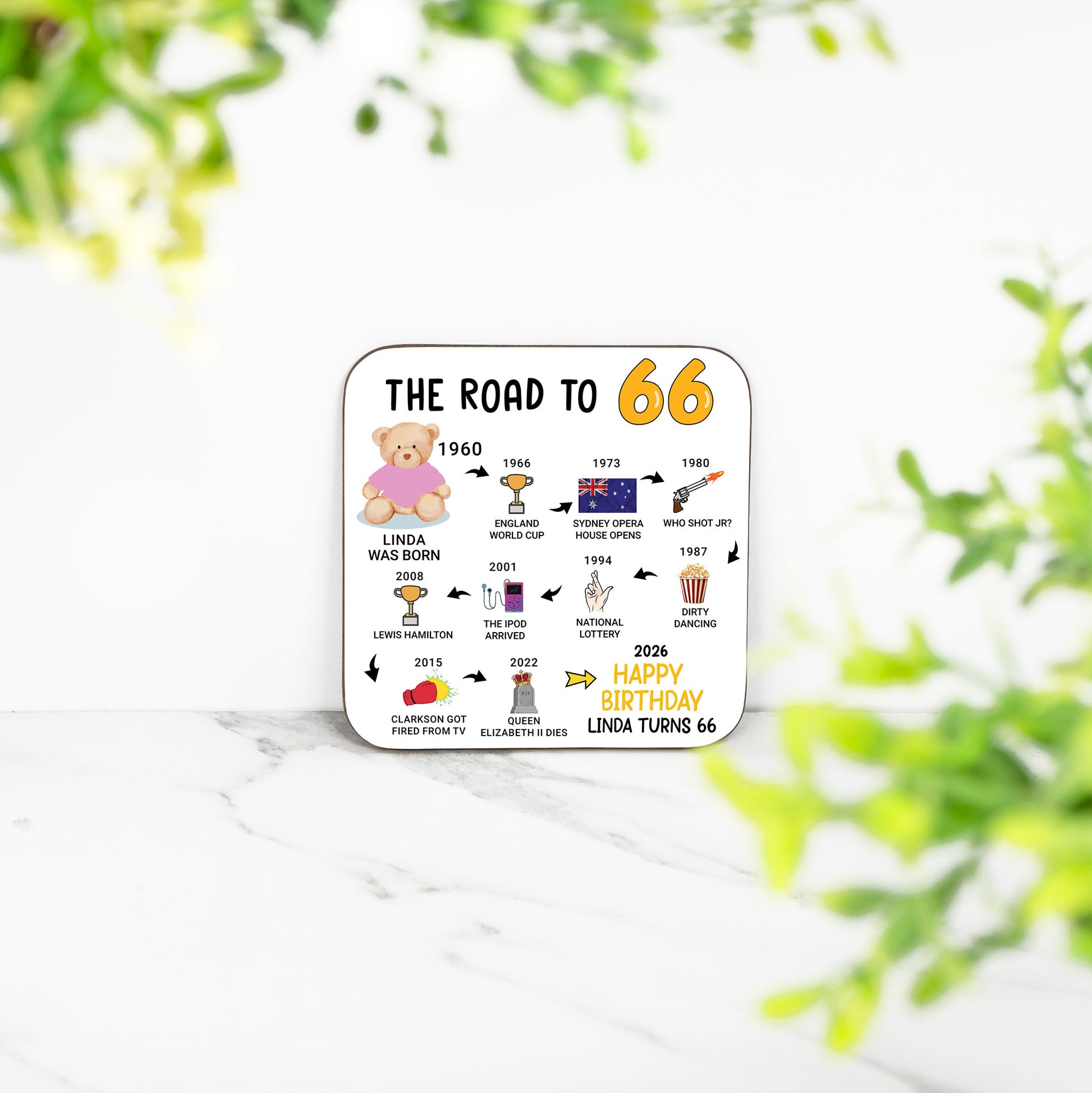 Celebrate a momentous 66th birthday with our exclusive Road from 1960 to 2026 coaster, born in 1960. This unique coaster isn't just a functional piece; it's a journey through time, commemorating the years gone by from 1960 to 2026. Crafted with care, it's a timeless and personalised gift that captures the essence of your loved one's journey to adulthood.