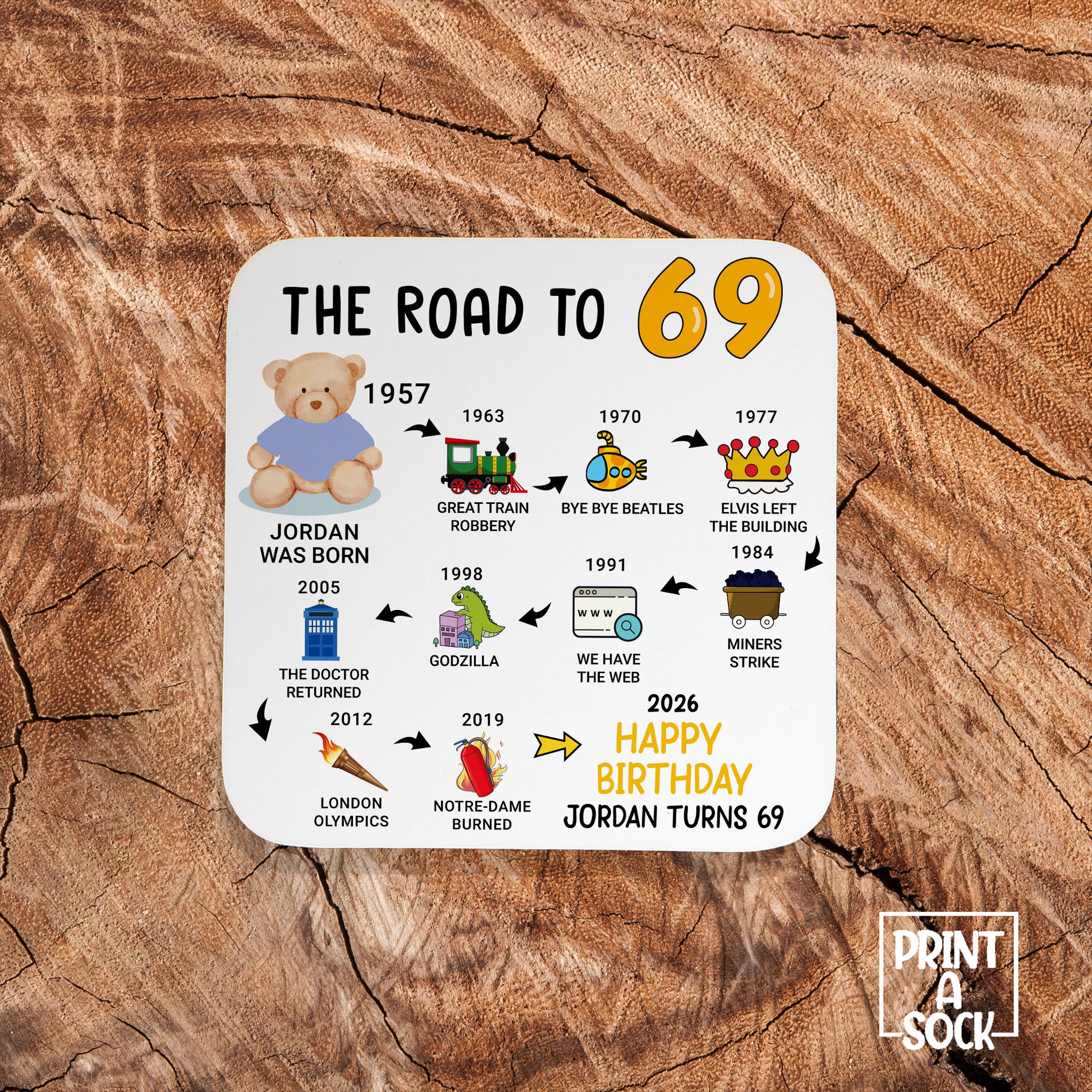 Personalised 69th Birthday Gift - Born in 1957 - The road to 2026 - Coaster