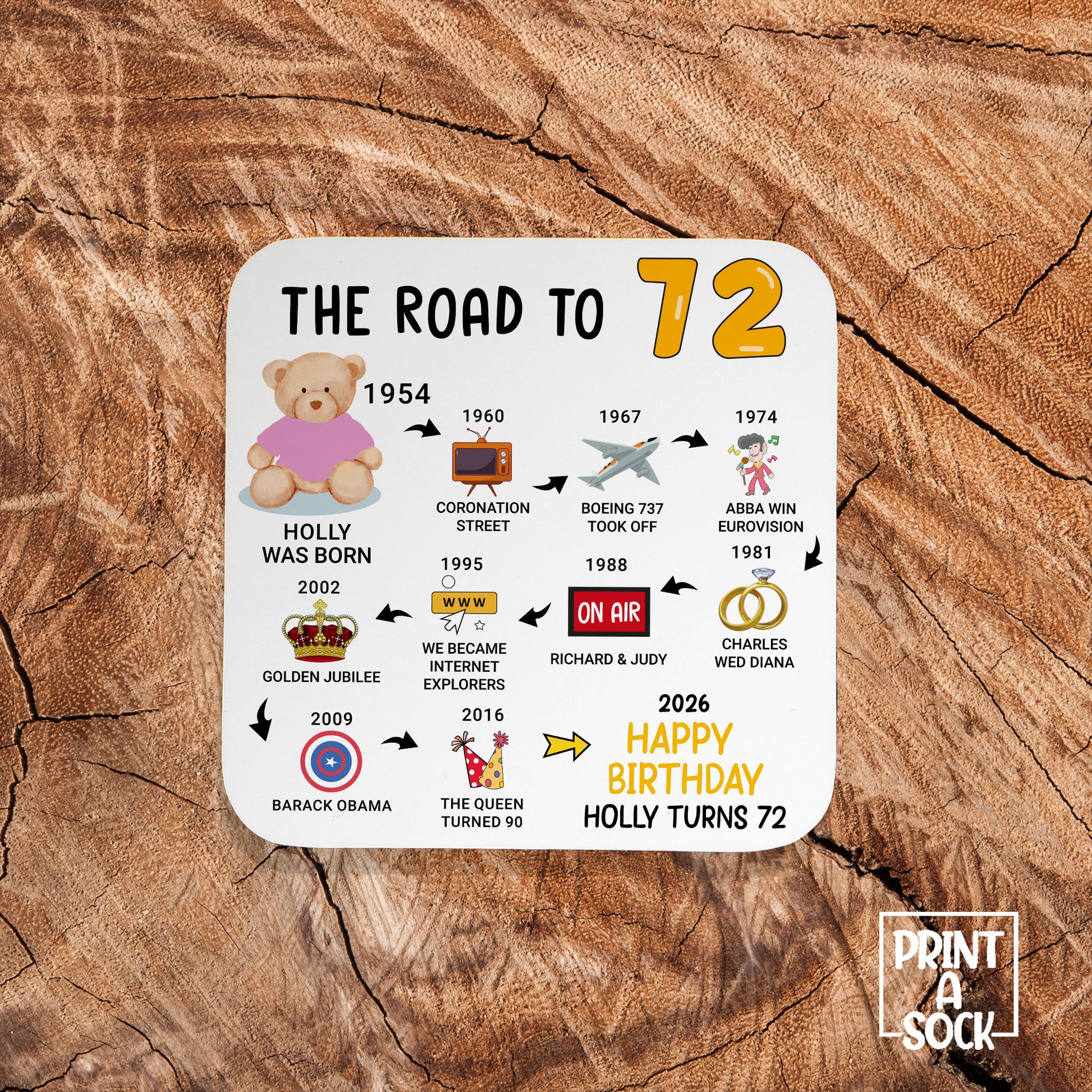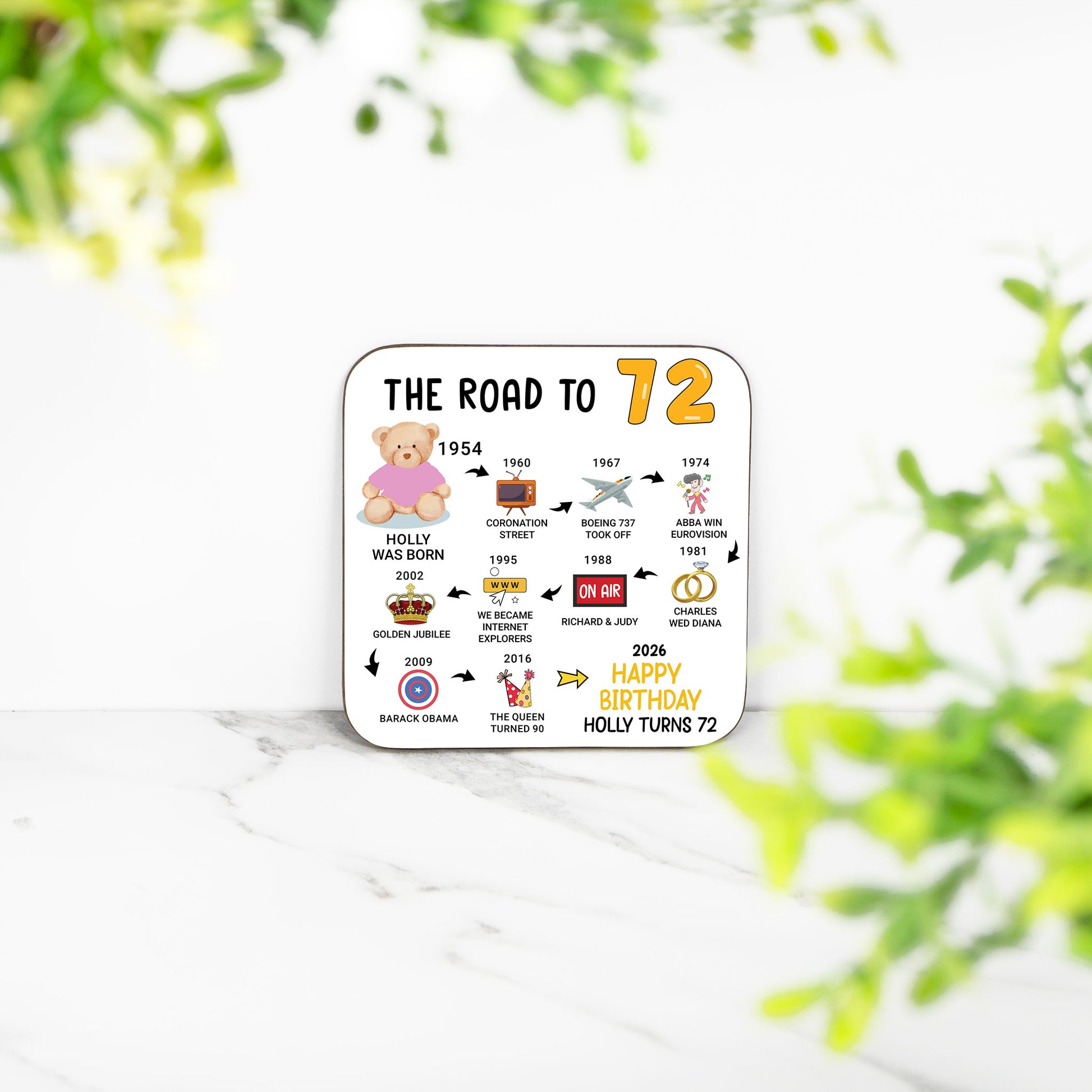 Personalised 72nd Birthday Gift - Born in 1954 - The road to 2026 - Coaster