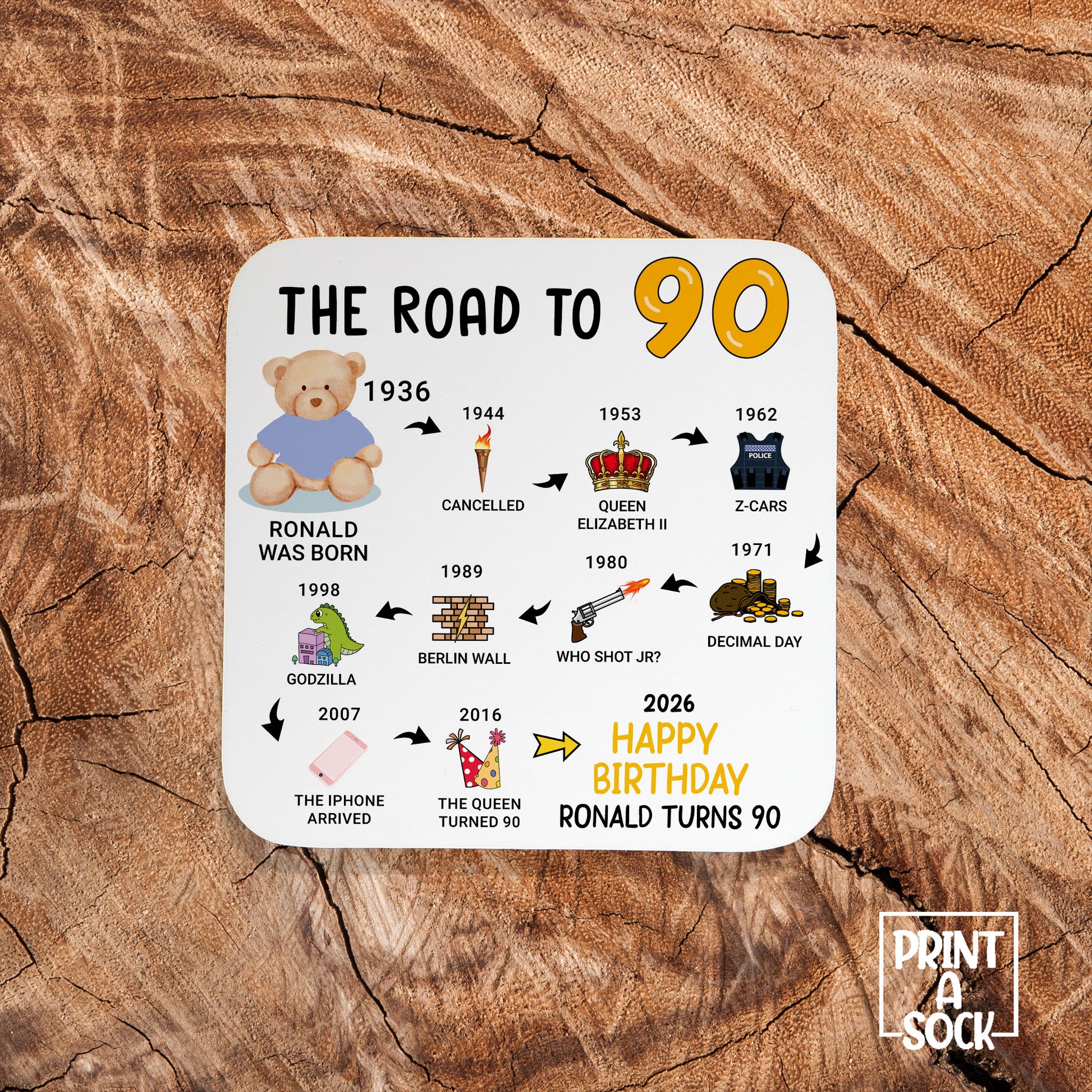 Celebrate a momentous 90th birthday with our exclusive Road from 1936 to 2026 coaster, born in 1936. This unique coaster isn't just a functional piece; it's a journey through time, commemorating the years gone by from 1936 to 2026. Crafted with care, it's a timeless and personalised gift that captures the essence of your loved one's journey to adulthood.