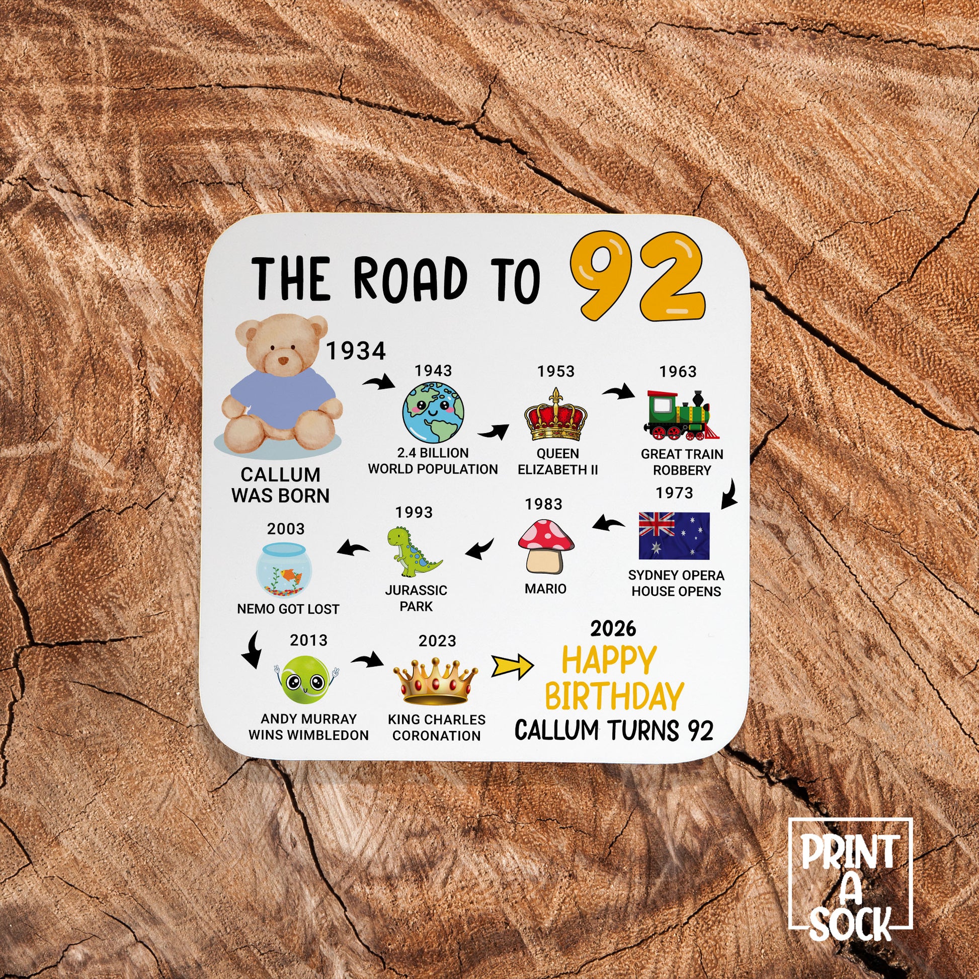 Personalised 92nd Birthday Gift - Born in 1934 - The road to 2026 - Coaster